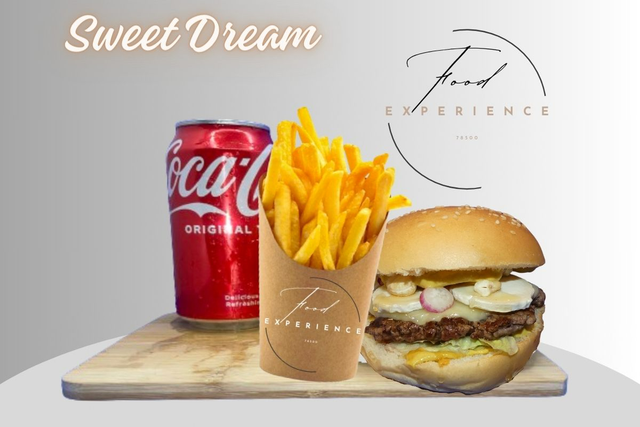 pain brioché, steak de viande, hachée fraîche, Mozza, chèvre miel, filet de moutarde, noix de cajou, salade, radis râpé
